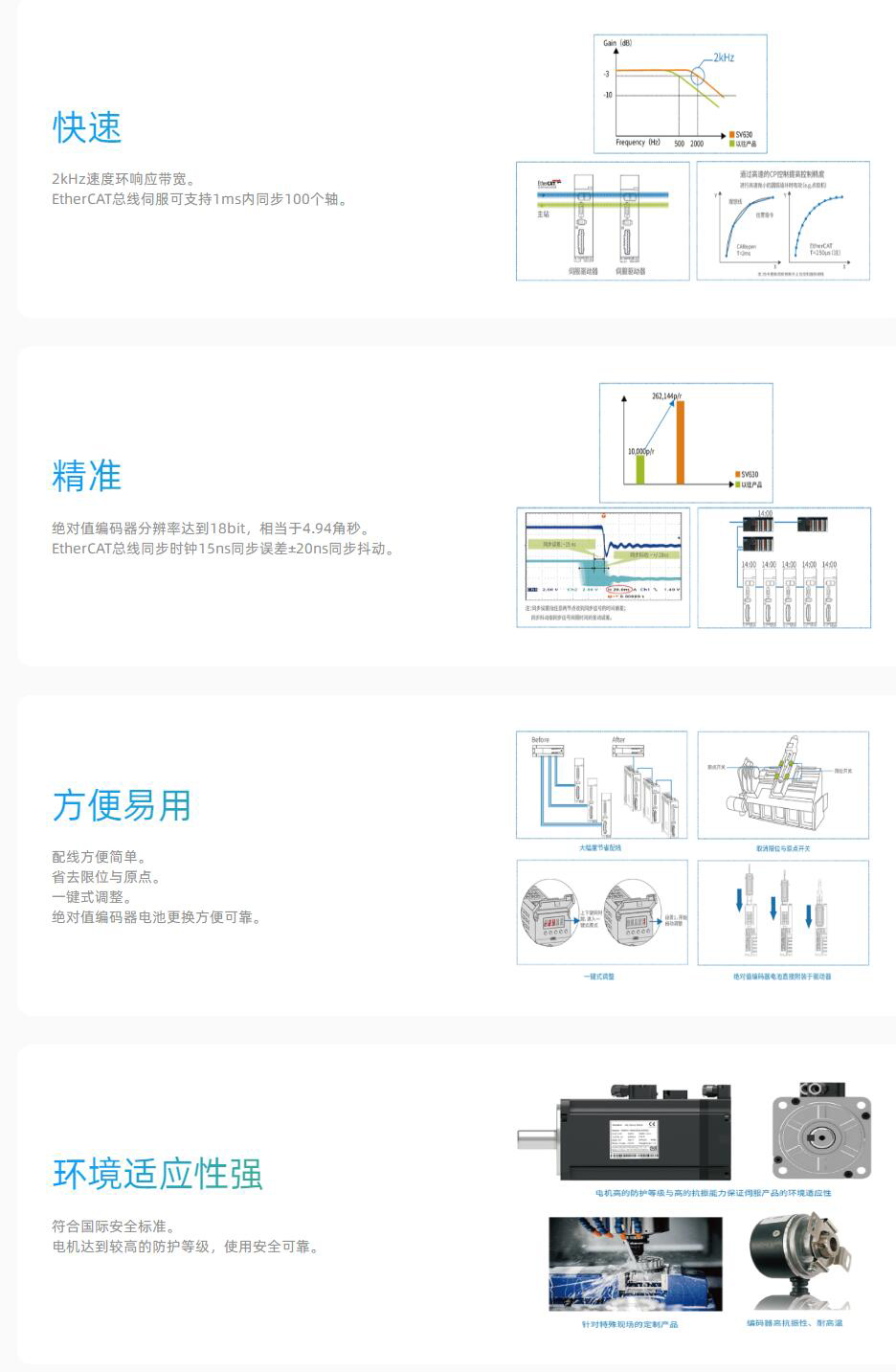 SV630系列伺服是汇川技术研制的高性能中小功率的交流伺服产品。该系列产品功率范围为0.05kW~7.5 kW,采用以太网通讯接口,支持EtherCAT、Modbus、CANopen和CANLink等通信协议,采用对应的通信接口,配合上位机可实现多台伺服驱动器联网运行。
