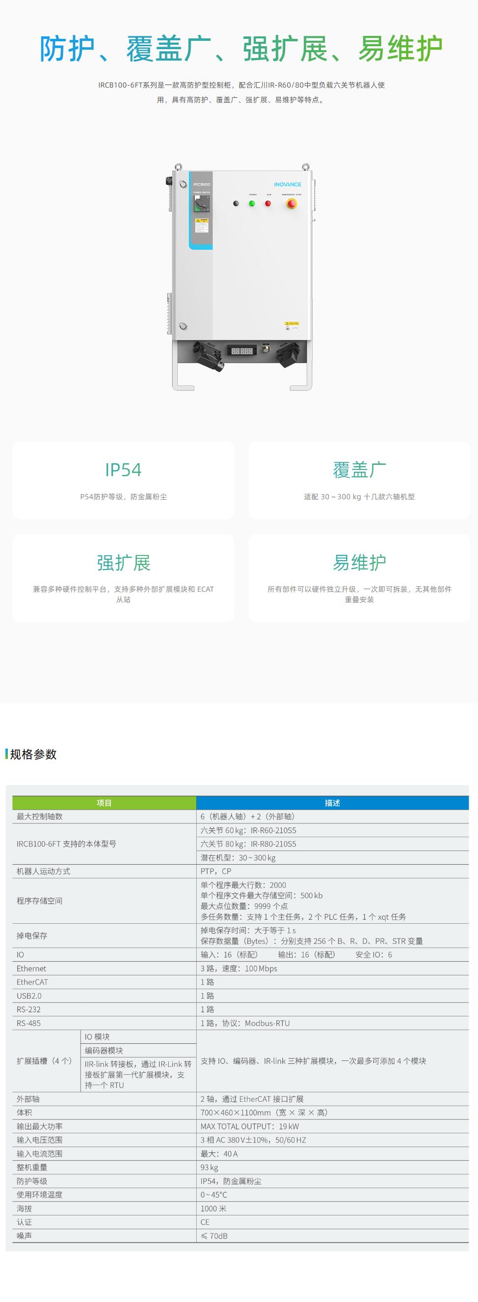 IRCB100-6FT系列是一款高防护型控制柜,配合汇川IR-R60/80中型负载六关节机器人使用,具有高防护、覆盖广、强扩展、易维护等特点。主要应用于装配、物料搬运、上下料、抛光打磨、去毛刺、涂胶、包装、激光切割等场景。