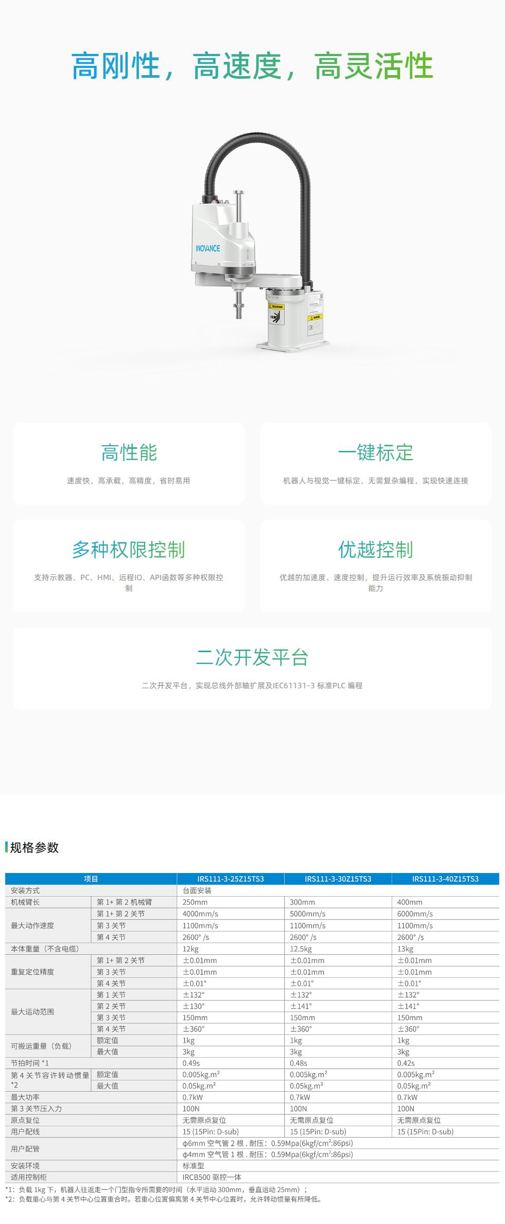 IRS111-3系列SCARA机器人产品是一款高性能紧凑型SCARA机器人,具有高刚性、高速度和高灵活性等特点,配备高性能IRCB500系列控制柜系统,具有很强的易用性和可靠性,此系列SCARA机器人可提供250-400毫米的臂长,支持台面安装方式,广泛用于搬运、贴标、分拣、锁付、检测、插件、装配等应用场合,为大批量、柔性化生产保驾护航。