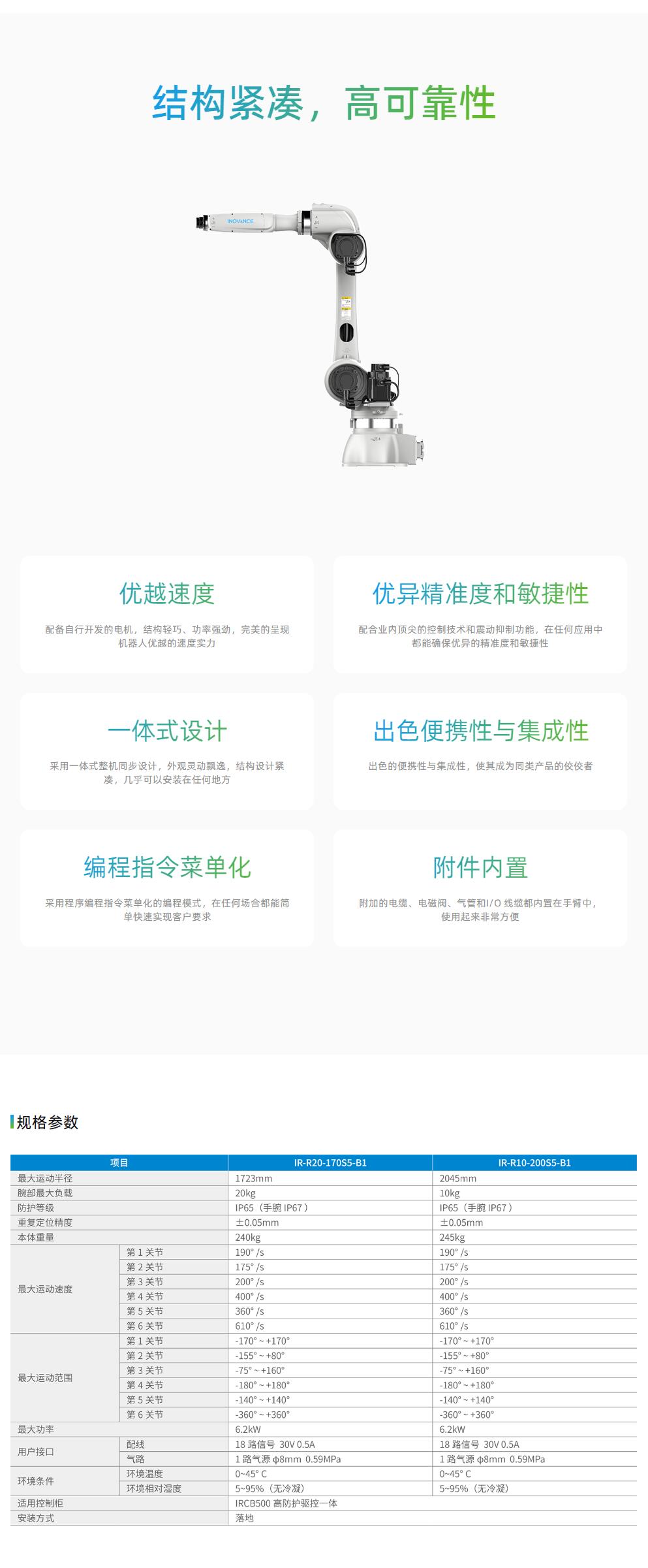 IR-R20系列六关节机器人臂长可达1723mm,负载可达20kg,具有结构紧凑、轻巧、柔性化高、重复定位精度高、运动速度快等特点。配备高防护IRCB500系列控制系统,具有很强的易用性和可靠性。可应用于通用行业的搬运、上下料、冲压自动化、装配、打磨抛光等领域。