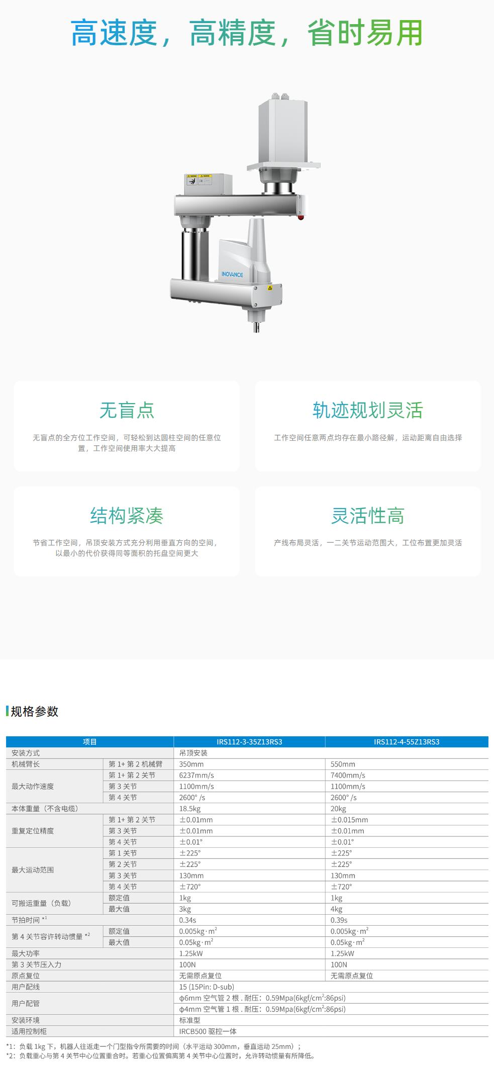 IRS112系列倒装SCARA机器人作为IRS111系列SCARA机器人在特殊领域的补充,属于高精度、中小负载、低成本、通用型机器人。倒装机器人采用吊顶安装方式,减少空间的占用,等臂长的结构设计保证其工作空间无死角,方便产线布置。同时,该机器人继承了IRS系列结构紧凑、灵活性高、运动速度快、精度高、扩展性高等诸多优点,具有很强的易用性和可靠性。