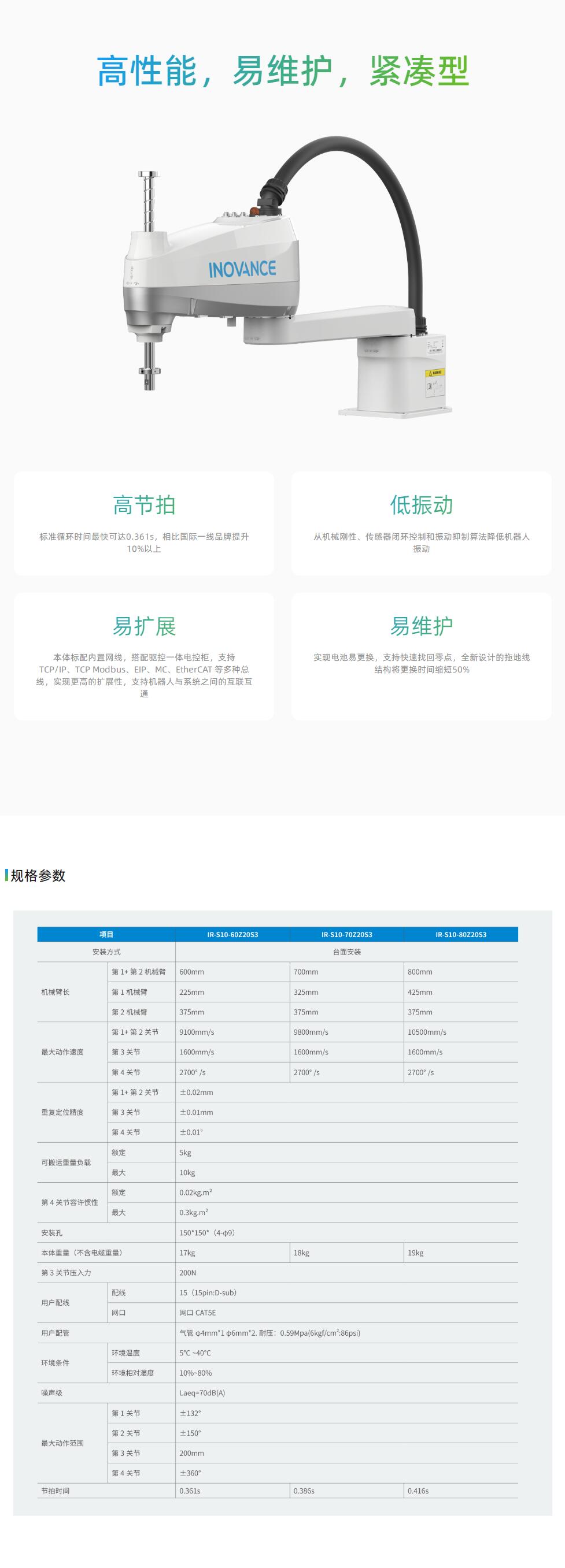 IR-S10系列是汇川技术推出的全新一代SCARA机器人,具备高性能、易维护、结构紧凑等优点,整机高度达到行业领.先水平,以其小巧的身子、节拍可适应更多的应用场景。应用行业主要分布在3C、锂电、光伏、显示行业,同时满足产品在装配、涂胶的场景应用需求。