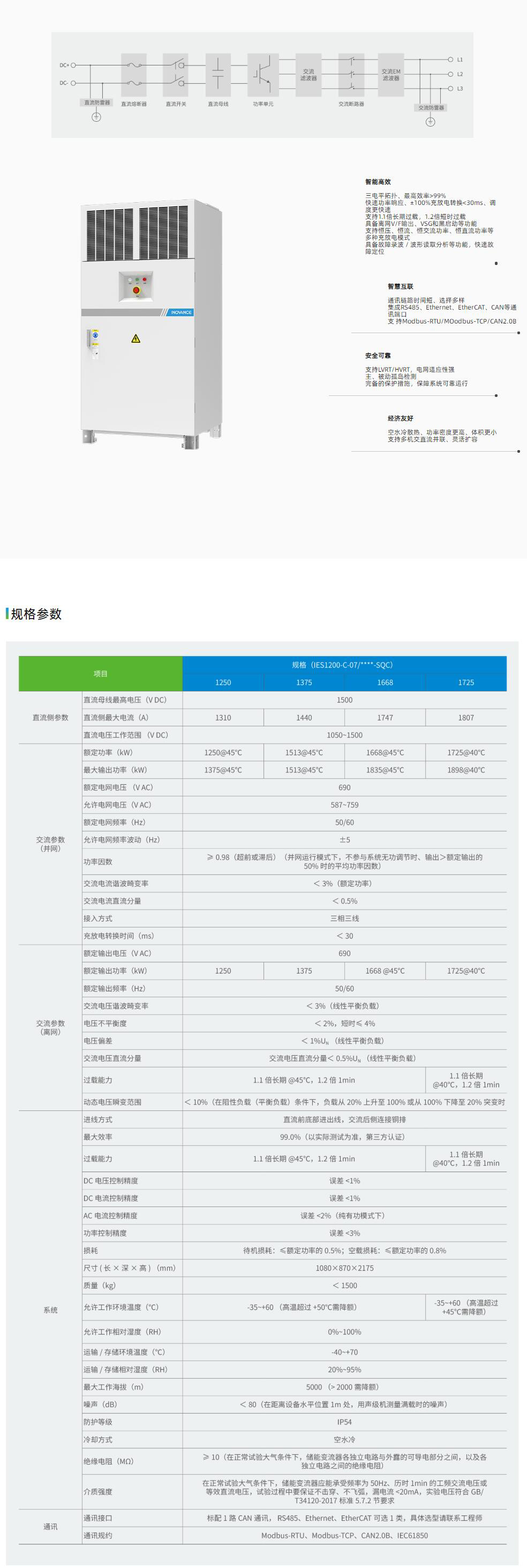 IES1200-C-07-1668-SQC为IES系列直流1500V大功率储能变流器,该变流器采用空水冷散热方案,具有高响应、高.效率、高功率密度、高集成度、高防护等特点,安.全可靠、应用灵活,适用于多个电压等级,用户可根据需求进行二次集成。整机IP54防护等级,可直接安装于户外,系统配置成本更低。