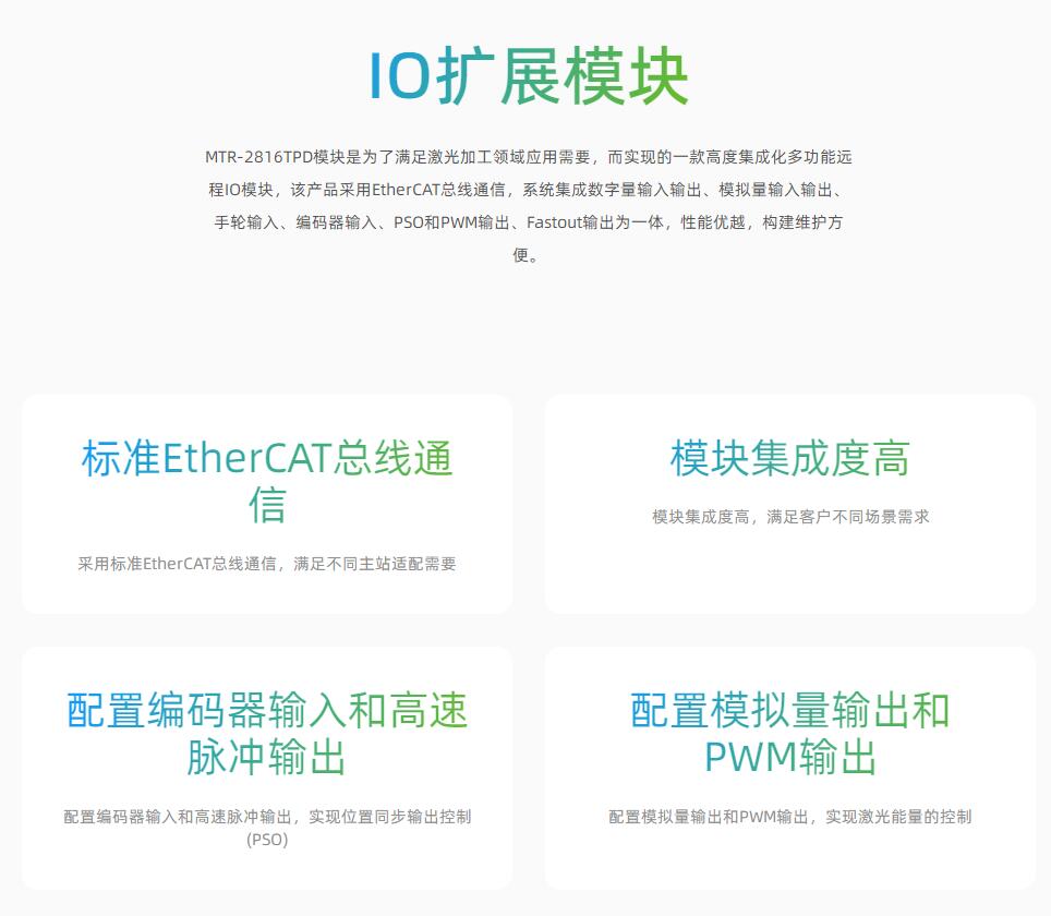 MTR-2816TPD模块是为了满足激光加工领域应用需要,而实现的一款高度集成化多功能远程IO模块,该产品采用EtherCAT总线通信,系统集成数字量输入输出、模拟量输入输出、手轮输入、编码器输入、PSO和PWM输出、Fastout输出为一体,性能优越,构建维护方便。