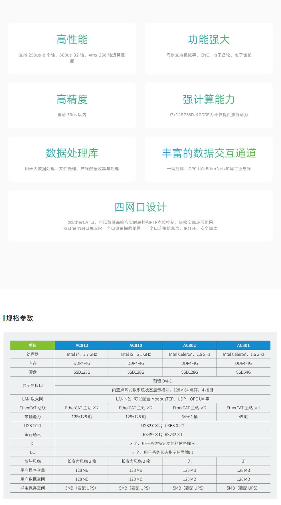 AC800高性能智能机械控制器,是基于Intel X86处理器硬件平台,符合PLCopen规范的高性能多轴运动控制器,以EtherCAT为总线,可以实现多轴伺服控制,尤其适用于先进制造业的高速生产装备和大型设备的控制。
