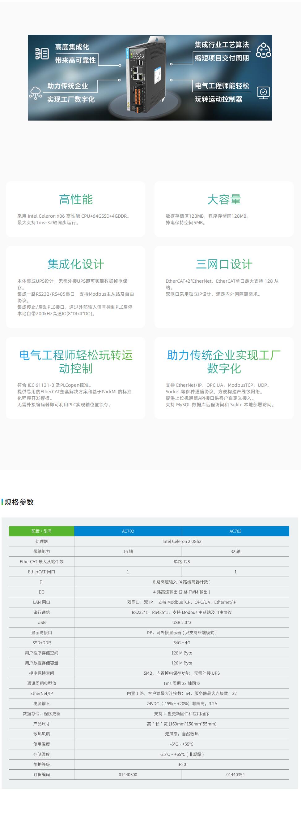 AC700系列书本式智能机械控制器,是基于Intel X86处理器硬件平台,符合PLCopen规范和IEC-61131-3标准的高性能运动控制器,支持ST,LD,SFC,CFC编程语言。标配EtherCAT工业以太网实时总线,可以实现32轴同步控制。全系配置两路千兆以太网口,支持EtherNet/IP与OPC UA等主流通讯协议,可以轻松的实现生产现场与IT系统的数据交互。同时,AC700本体集成UPS(不间断电源),即无需外接UPS即可实现数据掉电保存。汇川在工业自动化领域超过7年的软件平台深度迭代开发与工艺算法库积累,使其可以简单、稳定的搭建设备应用程序,尤其在高速、高精、高性能需求的大规模过程自动化、产线自动化和工厂自动化智能制造领域十分适用。