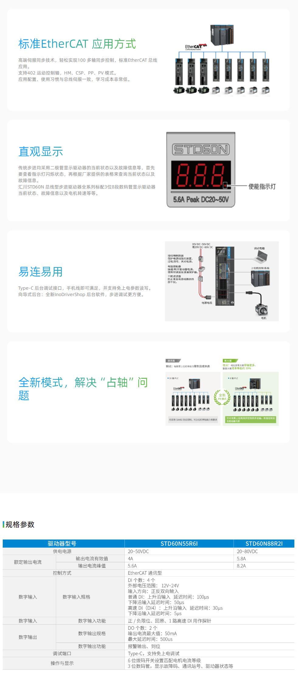 STD60N系列步进驱动器是汇川技术研制的一款发热小、运行平稳、加速能力强以及支持Type-C调试的通用总线型步进驱动器。该系列产品输出电流范围为0A~8.2A,支持标准EtherCAT通信协议,采用对应的通信接口,配合上位机可实现多台步进驱动器联网运行,搭载*新的工艺段功能,集回原、定速控制、定位控制于一体的多功能型位置模式,同时该模式不占上位机轴数。