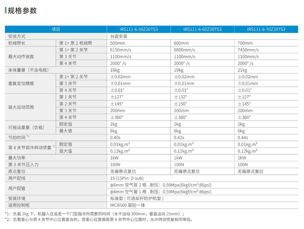 IRS111-6系列SCARA机器人产品是SCARA机器人高速高精领域的传承,具有高刚性、高速度和高灵活性等特点,配备高性能IRCB500系列控制柜系统,具有很强的易用性和可靠性。提供500-700毫米的臂长,可带200毫米的Z轴行程,广泛用于搬运、贴标、锁付、涂胶、检测、插件、装配等应用场合。