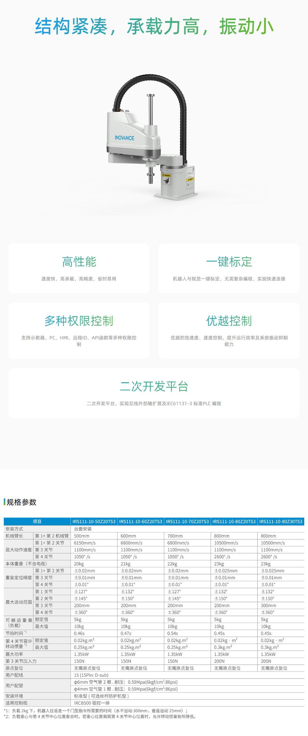 IRS111-10系列SCARA机器人是机器人产品在中负载领域的应用,具有高速度、高精度、效率高等特点,配备高性能IRCB500系列控制器系统,具有很强的易用性和可靠性。IRS111-10系列SCARA机器人手臂有500mm、600mm、700mm、800mm臂长等规格机型,Z轴行程200mm,提供台面安装方式。广泛应用于搬运、贴标、锁付、涂胶、检测、插件、装配等领域。